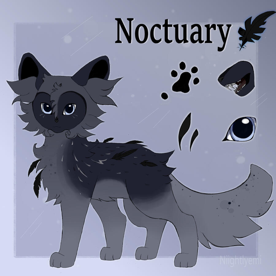 -------------PERSONALITYNoctuary enjoys peacefulness and other cats company, often making friendships with everyone and trying to keep everyone happy. He always sees stars even in the darkness, and tries to be positive in all situations.Noctuary is known as the Noctivigants leaders son, as well a a renowned noctivagant himself, hence his nickname, nocti. He is a skilled, and quiet fighter. Nocti also refused to wear the wrist bands most other felines do, he believes the light ruins his stealth, and ensures that when sick he will inform others.Noctuary enjoys watching stellar events such as shooting stars and finding constellations when he’s not busy with other duties.------------STORYNoctuary being the Noctivagants finest, often is burdened with many duties and obligations that lead him to overworking himself. He often used to butt heads with Hakon, though in a teasingly and friend way, the two often mocking eachother. Though Nocti has many friends, he enjoys his friendship with Requin the most.Noctuary made every attempt to become closer friends with the cold feline Requin, and though was often pushed away, the two became close. Noctuary’a favourite moments of them being watching the snow and stellar events together, in an eerie yet warming silence. Requin wouldn’t show it much to Noctuary, but he did care for Nocti, and Nocti noticed and loved his company, often teasing and annoying Requin whenever he had the chance.Noctuary passed away on an important mission for the Noctivagants, due to another clan members mistakes. Many cats remember him as the strong and kind feline he was.------------DESIGN NOTES:His design is symmetrical, and there’s a slight gradient between his fur vertically.!!His story is being told through Fallen Vinfelde, as well as a separate, small series which will be dedicated to his backstory.-------DESIGNER: Niightlyemi