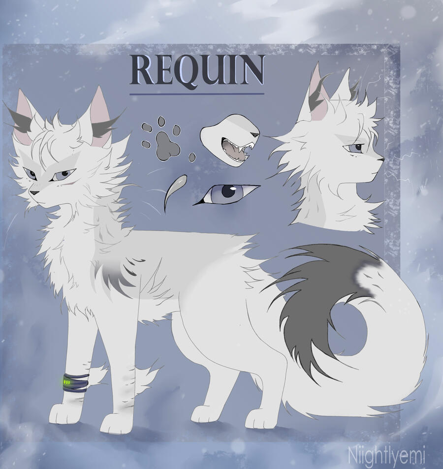 ---INTROThe leader of the warriors division in the Nighteds. A tired, strong, and independent feline who enjoys the rain, snow, and being alone. Even though he leads the warriors division, he often sneaks out of Solitude to take in the quietness and watch storm clouds and rain fall by himself.-------------PERSONALITYRequin speaks softly and clearly, often lacking any empathy or remorse in his tone. He keeps to himself, often quick tempered with a snappy attitude when instructions are not followed correctly or are disobeyed. Many of the younger warriors fear him and dare not disobey.He is known as the finest warrior of Vinfelde, being extremely agile and quick on his feet, and knows many rather unusual tactics when battling that others do not expect. Requin's claws are said to be sharper than needles.Requin often leaves Solitude to watch snowfall and mist in the city, he finds peace and comfort in being alone whilst taking in the beauty of the cold, and sometimes eerie weather.------------STORYRequin has faced many losses throughout his life, often believing that he was the reason for the pain and loss of his loved ones, in return trying not to form any further kind of friendship or bond aside from duties in Solitude. His last ray of happiness, though he didn't show it often, was Noctuary, whom he teasingly called owlface. The two would often spend time together, mostly Noctuary making every attempt to be near him and bother him whilst withstanding Requins cold demeanor.After Noctuary's passing, Requin never was the same again, and descended into the coldest and least approachable version of himself.------------DESIGN NOTES: